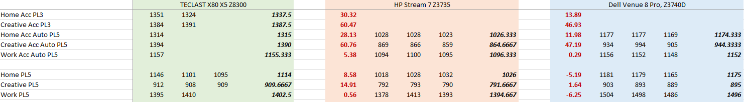 Жирным курсивом выделены средние значения по каждому тесту для каждого из тестируемых устройств, а темнокрасные жирные значения – это процент выигрыша в производительности TECLAST X80 Plus (и процессора Intel Atom X5 Z8300) относительно того или иного устройства в конкретном тесте.