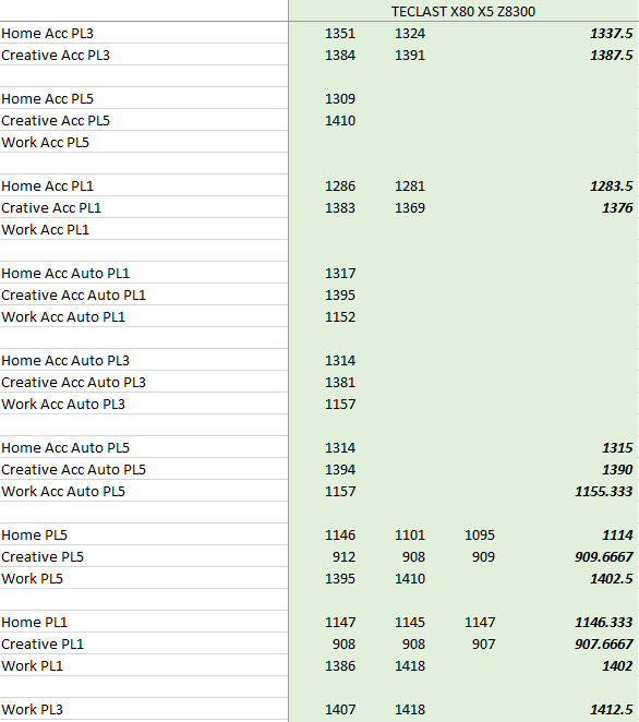 Также для тестов присутствуют пометки PLx – это так называемый “уровень мощности” – Power Level – регулирования напряжения, которое подается на процессор (в пределах сотых вольта) – новые возможности управления энергопотреблением процессоров Intel Atom X5/X7 средствами Intel Dynamic Platform and Thermal Framework. Данная опция управляется средствами Windows 10 – в детальных настройках схемы энергопотребления. Причина появления данных PL – я постарался найти зависимость производительности от уровня питания (1 – самый низкий, 5 – самый высокий) – но, как видно из тестов – все расхождения в разных режимах – в пределах погрешности, никакого прироста производительности увеличение питания Intel Atom X5 Z8300 – не дает. Для того, чтобы оценить производительность Intel Atom X5 Z8300 в тех же тестах с разным уровнем питания – привожу ниже расширенную таблицу с результатами тестов при разных – PL1-PL3-PL5 – условиях питания TECLAST X80 Plus.