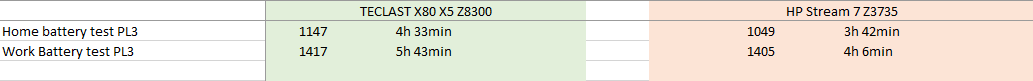 Как видите, при объеме аккумулятора в 3800мАч, TECLAST X80 с включенным на 33% яркости экраном отработал в 2х стандартных тестах (без ускорения) очень и очень хорошо, обогнав HP Steam 7 в одном тесте на 50 минут, а другом – на 1 час 37 минут (что очень хорошо). А чтобы понять, на что “способен” HP Stream 7 по времени автономной работы – смотрите тесты “времени жизни” HP Stream 7 здесь. А подробно про время автономной работы TECLAST X80 – смотрите где-то через месяц – чтобы детально прогнать все тесты – требуется много времени Winking smile